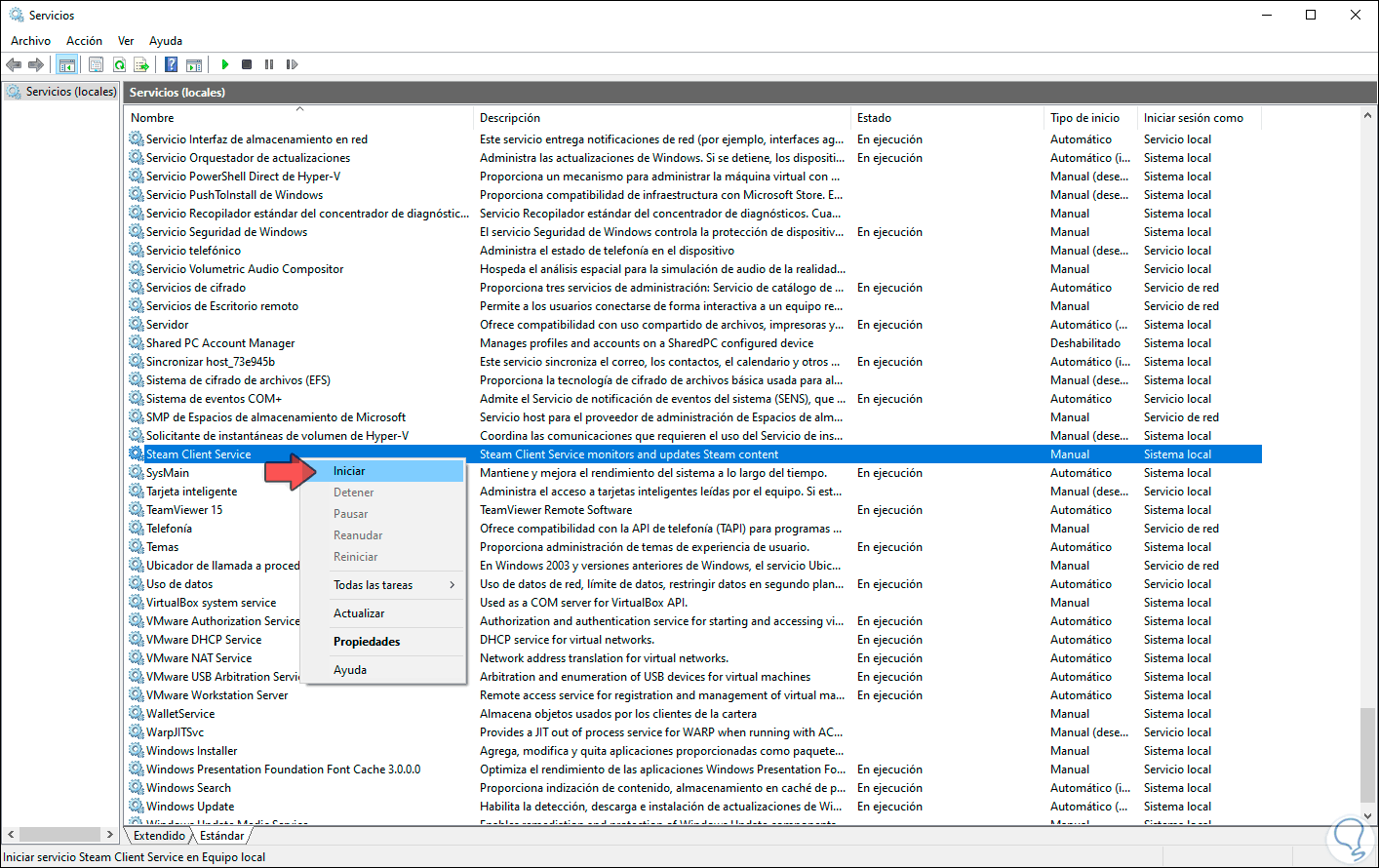 Para acceder a los servicios de Windows, allí ubicamos el servicio Steam Client Service, damos clic derecho sobre él y seleccionamos “Iniciar”. Podremos acceder a la plataforma para comprobar su correcto funcionamiento.