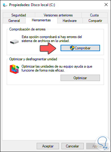 En la ventana que será desplegada vamos a la pestaña “Herramientas” y pulsamos en el botón “Comprobar” ubicado en la sección “Comprobación de errores”: