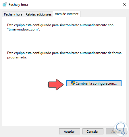 Damos clic en la línea “Fecha y hora” y en la ventana desplegada vamos a la pestaña “Hora de Internet” donde veremos lo siguiente: