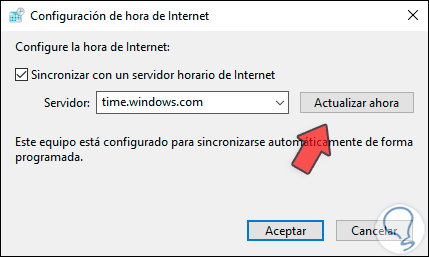 Damos clic en el botón “Cambiar la configuración” y en las opciones desplegadas nos aseguramos que la casilla “Sincronizar con un servidor horario de Internet”. Una vez activa esta casilla damos clic en “Actualizar ahora” para completar el proceso de actualización de la hora del sistema.