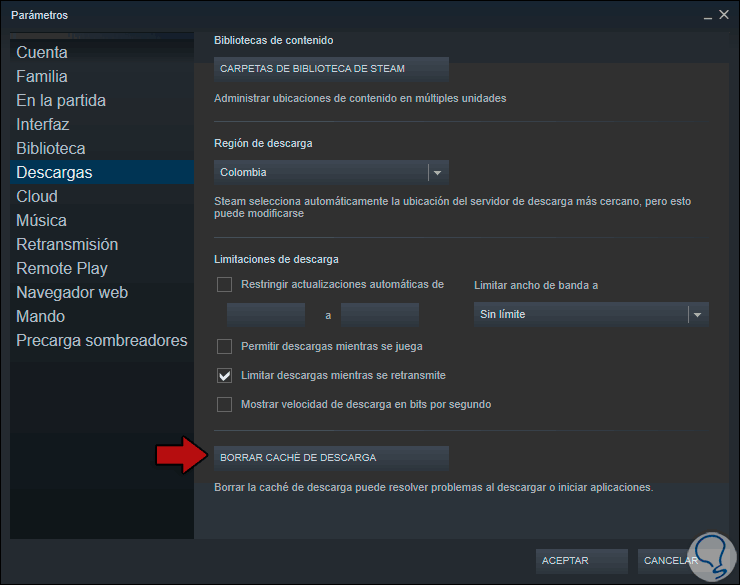 Luego, en la ventana desplegada, iremos a la sección “Descargas” y allí pulsamos en el botón “Borrar caché de descarga”: