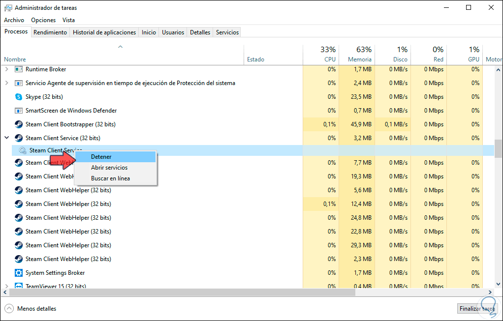 Para esto, en Windows 10, vamos al Administrador de tareas y en la pestaña “Procesos” iremos a la sección “Procesos en segundo plano” y allí ubicamos la línea “Steam Client Service”, desplegamos sus opciones y damos clic derecho sobre el servicio “Steam Client Service” y seleccionamos “Detener”: