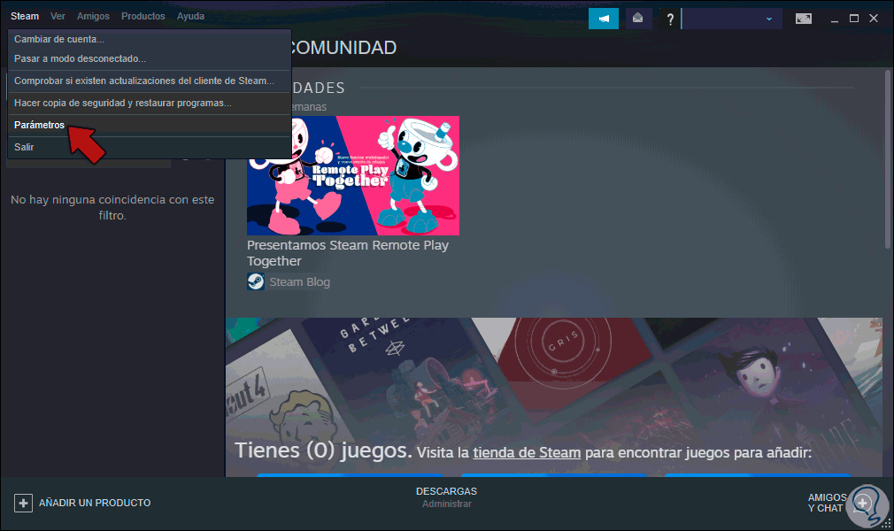 Otra opción es eliminar la cache de Steam la cual se aloja con cada descarga de la red, para esto accedemos a Steam y desde el menú Steam seleccionamos “Parámetros”: