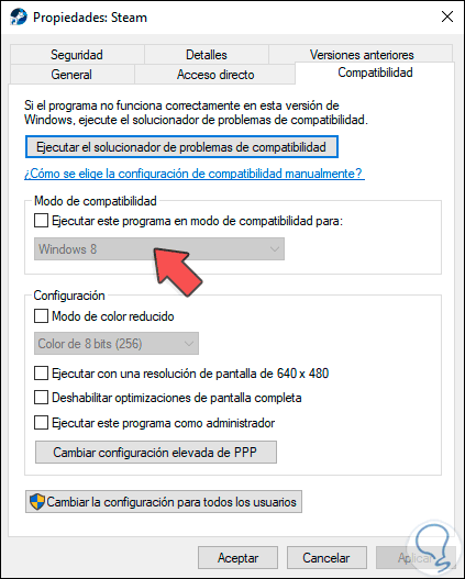 Esta es una opción de Windows 10 en la cual podemos ejecutar Steam en modo de versiones anteriores del sistema, como Windows 8 o Windows 7, esto se da por temas de compatibilidad y ejecución de procesos pero puede llegar a causar determinados errores en la ejecución normal de Steam.