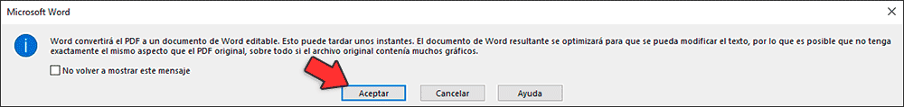 Posteriormente veremos el siguiente mensaje. Damos clic en "Aceptar" ya que este mensaje indica que se creará con opciones de edición.