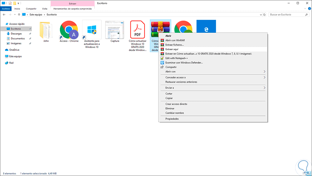 Una vez descargado procedemos a extraerlo dando clic derecho sobre el y seleccionando la opción adecuada: