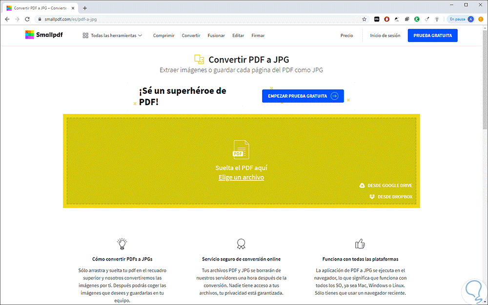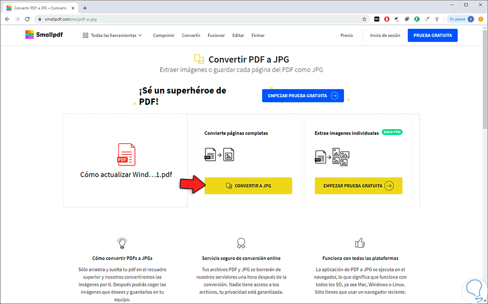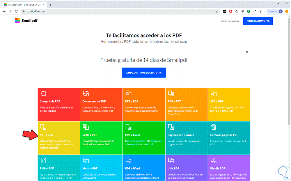 Se nos mostrará el siguiente entorno. Allí damos clic sobre la opción “PDF a JPG”