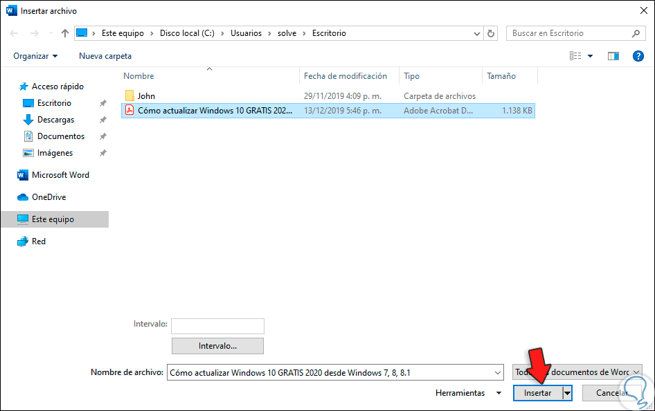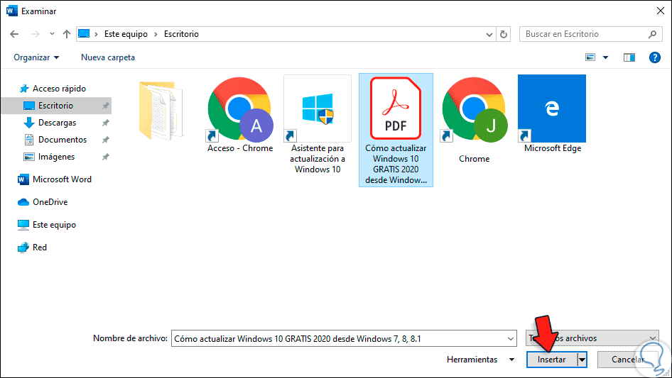 Procedemos a buscar el archivo PDF. Damos clic en "Insertar" para que dicho archivo PDF sea añadido como objeto en el documento.
