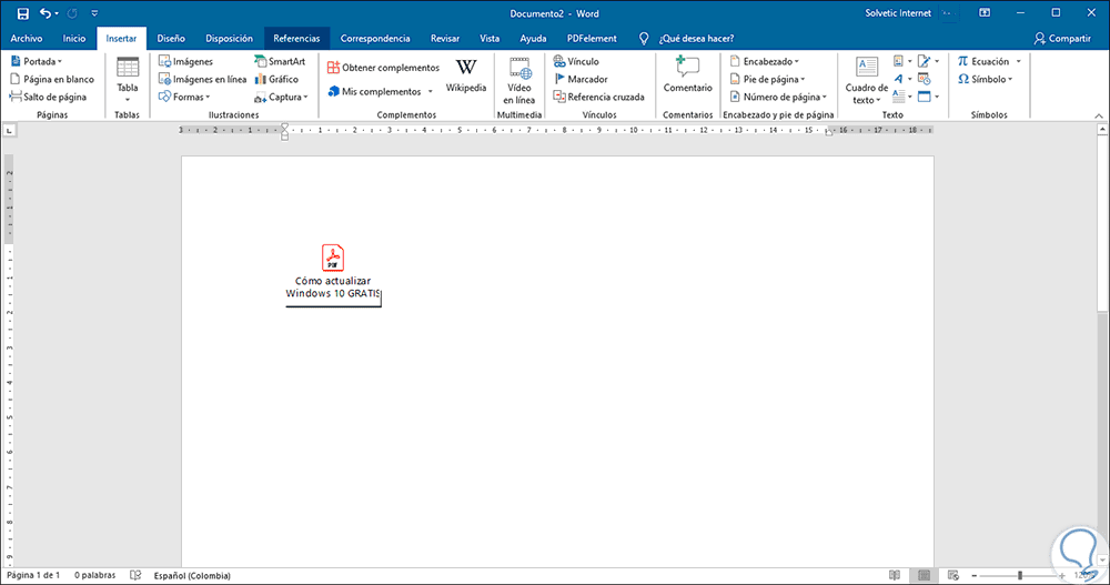 Con estas opciones que te ha explicado Solvetic será posible insertar un archivo PDF o bien acceder a su contenido en Word de una forma complemente funcional.