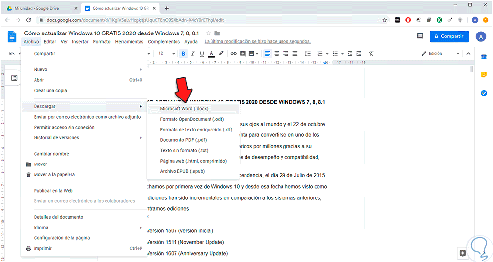 Una vez abierto en Google Docs, vamos al menú "Archivo" y allí seleccionamos "Descargar" / "Microsoft Word" (.docx):