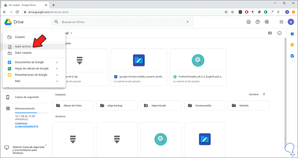 Allí damos clic en "Nuevo" / "Subir archivo":