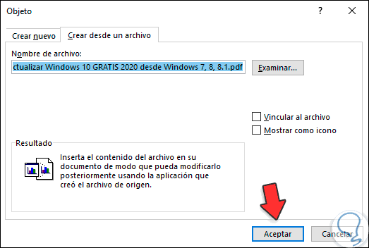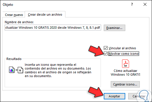 Luego de esto seleccionamos el PDF y podemos activar la casilla “Mostrar como ícono”. Pulsamos en "Aceptar".