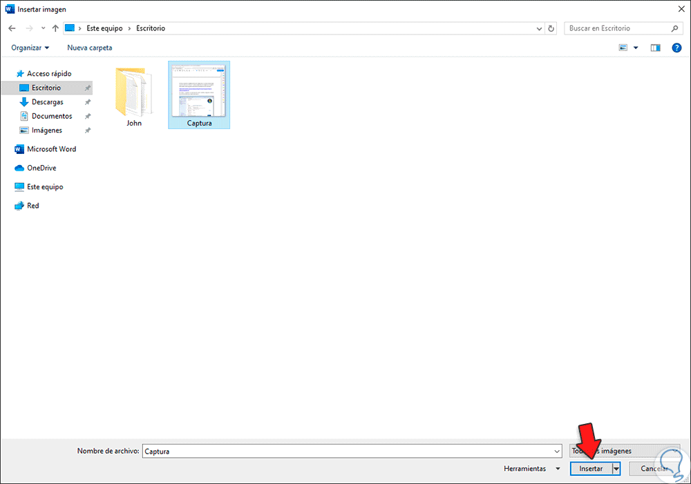 Para este método debemos capturar la imagen del archivo PDF usando la herramienta de recortes integrada en Windows 10 o alguna de un tercero, luego, en Word, vamos al menú "Insertar" y en el grupo "Ilustraciones" damos clic sobre "Imágenes" y seleccionamos la imagen que hemos capturado. Damos clic en "Insertar".