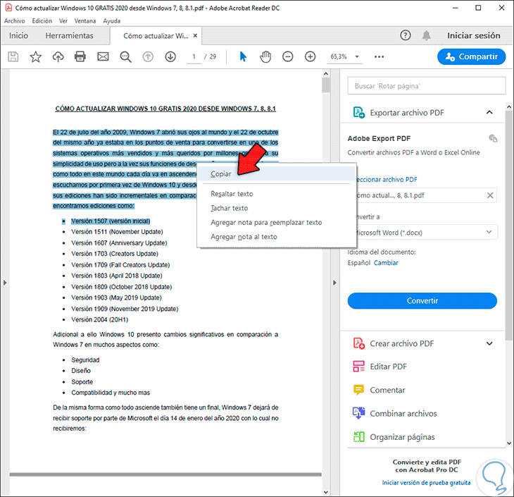 Este es un mecanismo gracias al cual podemos seleccionar el texto deseado en el archivo PDF y luego copiarlo en Microsoft Word.