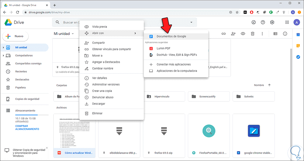 Luego seleccionamos el archivo PDF deseado y una vez cargado damos clic derecho sobre el y seleccionamos "Abrir con" / "Documentos de Google":