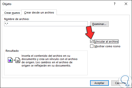 En la ventana desplegada vamos a la pestaña “Crear desde un archivo” y allí activamos la casilla “Vincular al archivo”:
