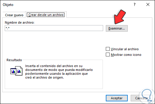 Será desplegada la siguiente ventana y allí iremos a la pestaña “Crear desde un archivo”. Con este método, será posible ajustar parámetros del archivo tales como cambiar la posición, cambiar el tamaño o el color, así como controlar el texto que se ajusta alrededor del objeto que hemos integrado. En esta ventana damos clic sobre el botón "Examinar".