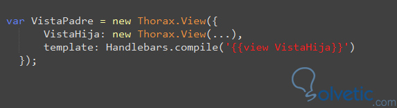 Para poder construir este tipo de vistas podemos utilizar el helper view de Thorax que nos permite pasarle el contenido adecuado al motor de plantillas Handlebar, de esta forma podemos lograr construir una vista padre y dentro una vista hija, al momento de compilar en la plantilla podemos pasar el valor de la hija para que se refleje en nuestra vista padre original, veamos en la siguiente imagen un código que nos puede ilustrar este caso: