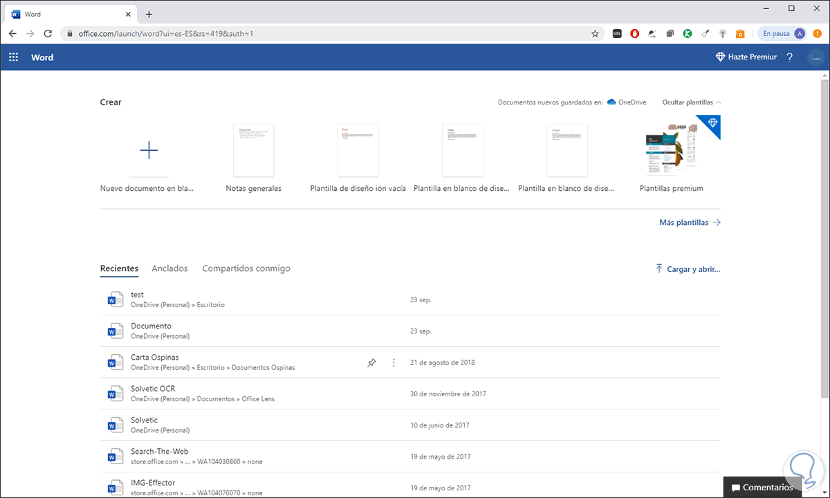 Este es uno de los mecanismos más sencillos para sacar provecho. Aunque no al 100% de todo lo que Microsoft Word nos ofrece, esta opción es ideal para editar diversos archivos alojados en OneDrive o bien cargar documentos locales o bien crear un nuevo documento en blanco o usar alguna de las plantillas disponibles.