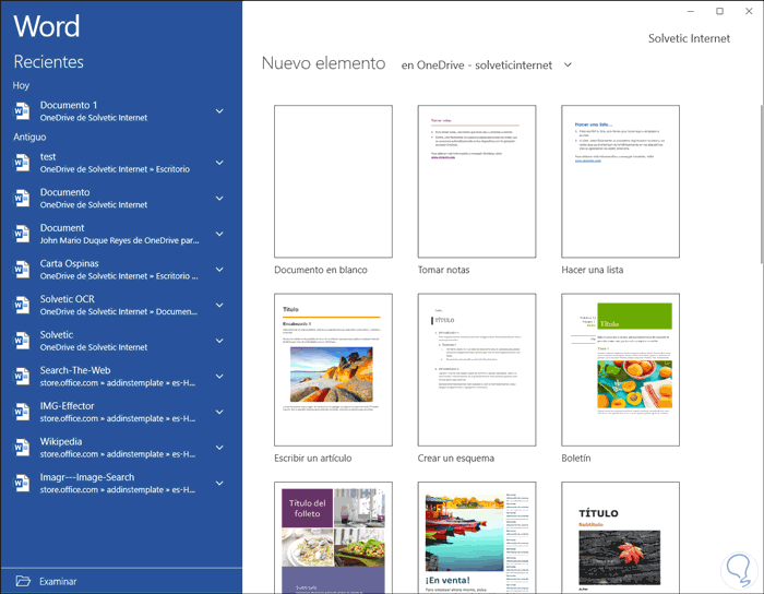 Al acceder a Word podemos elegir un nuevo archivo o usar plantillas: