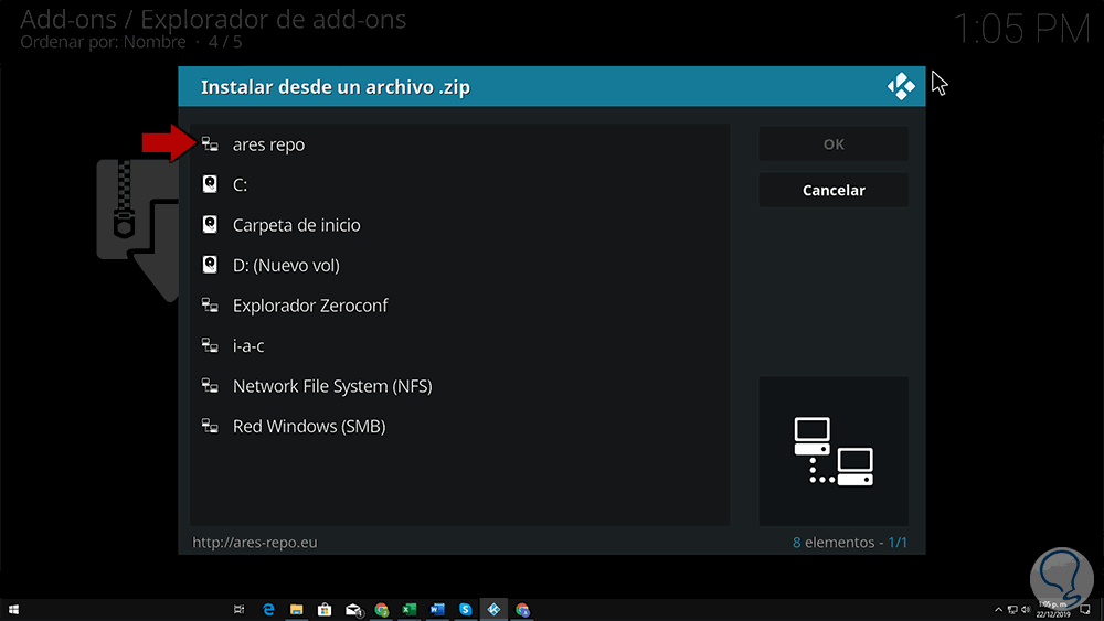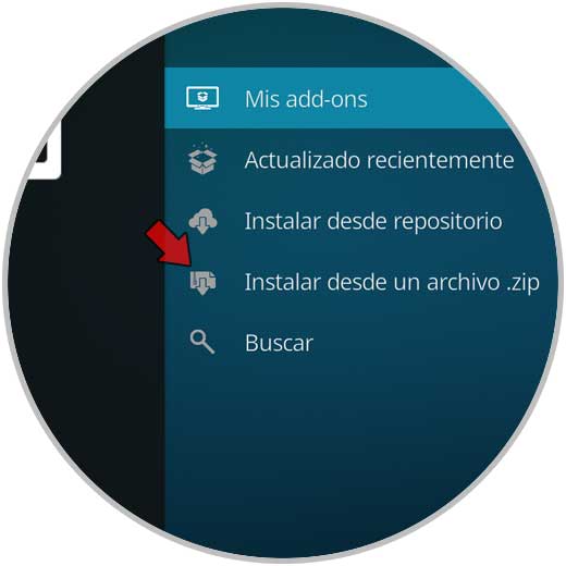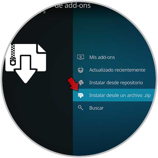 Una vez descargado iremos a Kodi y desde la sección “Add-ons” seleccionamos la opción “Instalar desde un archivo .zip”: