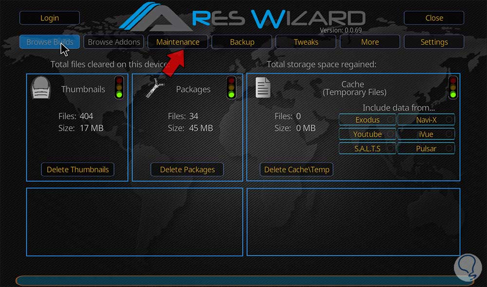 Ahora para limpiar los archivos temporales de Kodi Exodus, vamos a la pestaña “Maintenance” y allí encontramos las opciones: