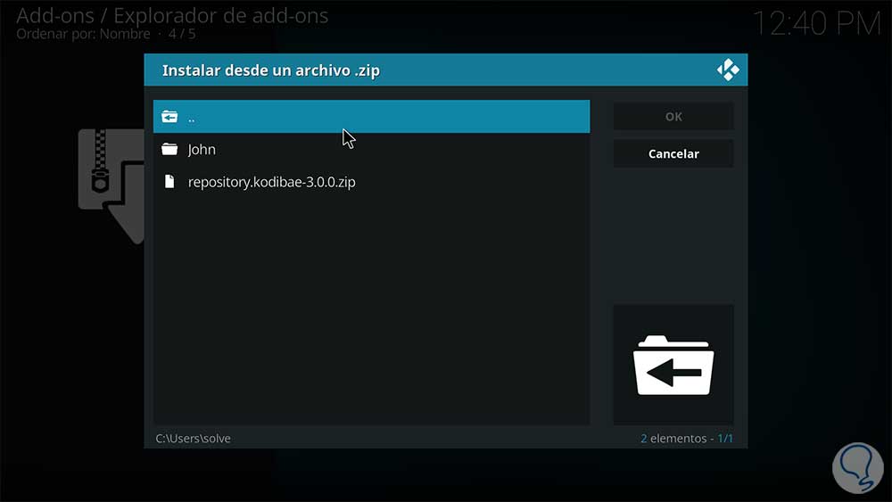 Pulsamos en OK y luego iremos atrás y seleccionamos “Instalar desde un archivo .zip”: