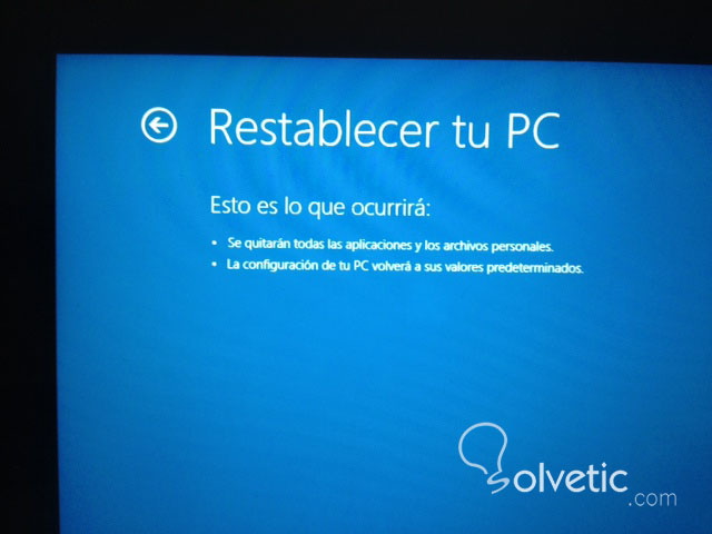 La otra opción sería la de Restablecer tu PC esto es una reinstalación del Sistema Operativo, con lo que SI se borrará todo, si tienes copia de seguridad de datos y el sistema con la anterior opción ni arranca tienes esta forma de arreglar modo de fábrica tu Windows 8.
