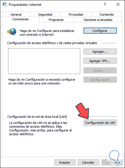 En la ventana desplegada iremos a la pestaña “Conexiones”. Damos clic en el botón “Configuración de LAN”