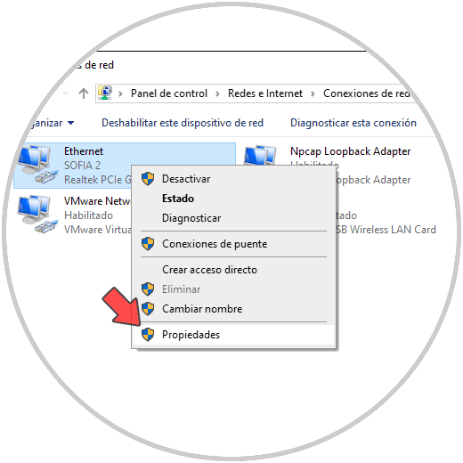 Allí damos clic en “Cambiar configuración del adaptador” y en la siguiente ventana damos clic derecho sobre el adaptador actual y seleccionamos “Propiedades”: