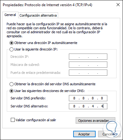 Damos clic en Propiedades y ahora activamos la casilla “Usar las siguientes direcciones de servidor DNS” y asignamos lo siguiente: