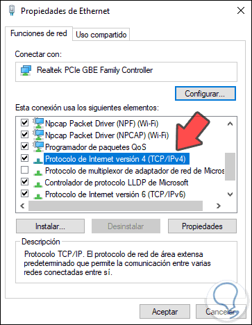 En la ventana emergente seleccionamos la línea “Protocolo de Internet versión 4”: