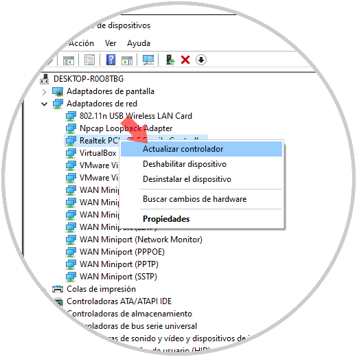 Para actualizar el controlador iremos al Administrador de dispositivos dando clic derecho sobre el menú Inicio y una vez allí vamos a la sección “Adaptadores de red”. Damos clic derecho sobre el controlador actual y seleccionamos “Actualizar controlador”: