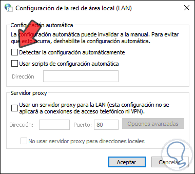 En la siguiente ventana debemos desactivar la casilla “Detectar la configuración automáticamente”. Pulsamos en Aceptar para salir del asistente.