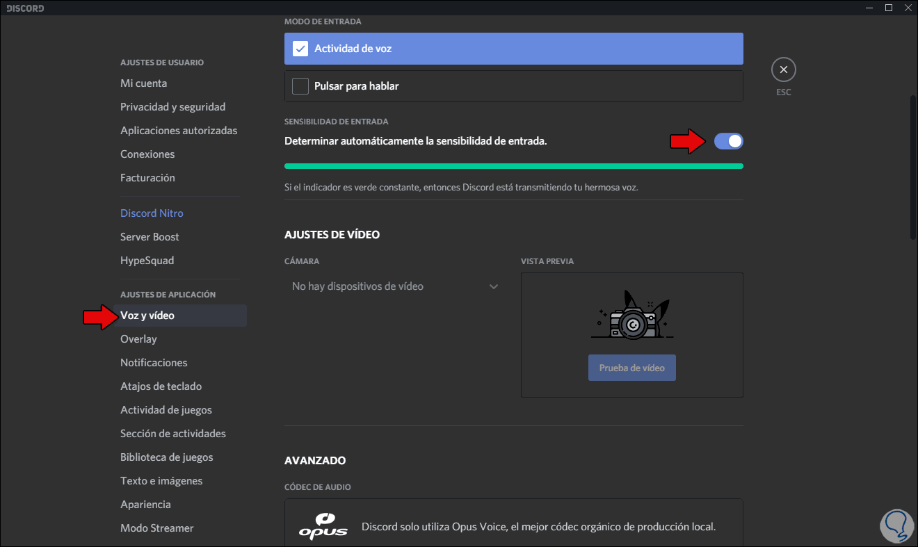 En la ventana que será desplegada iremos a la sección “Voz y video” y allí ubicamos la línea “Sensibilidad de entrada” y validamos que el interruptor este activo: