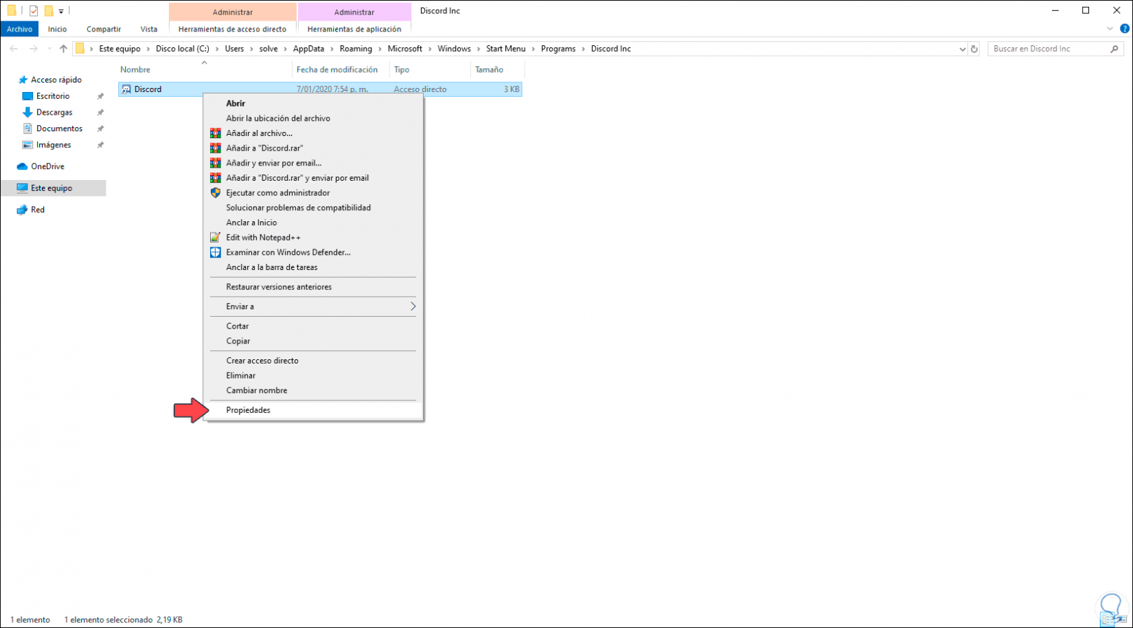 Para ello ubicamos el acceso directo de la app, damos clic derecho sobre él y seleccionamos “Propiedades”: