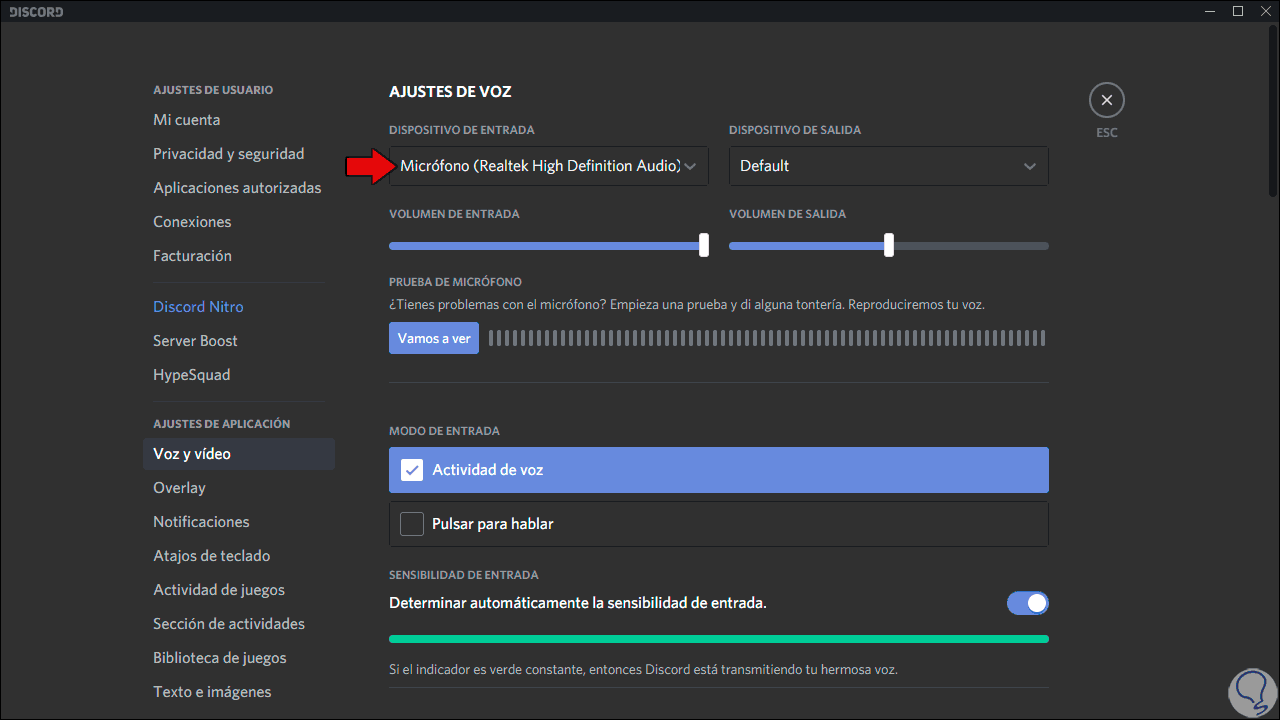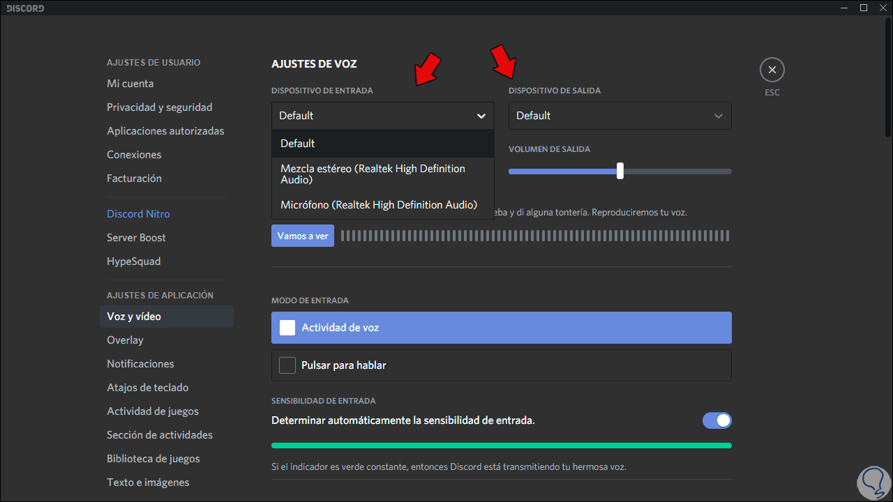 8. Configurar dispositivos de entrada y salida en Discord para solucionar micrófono no se escucha