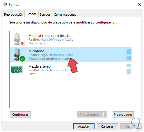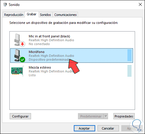 Allí damos clic sobre “Sonidos”, vamos a la pestaña “Grabar” y seleccionamos el micrófono actual: