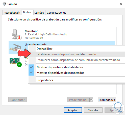 Si el micrófono activo no está configurado como el hardware por defecto es normal que este no sea reconocido por Discord, para validar esto iremos a la configuración del sonido desde el Panel de control y allí, en la pestaña Grabar, daremos clic derecho sobre el micrófono actual y seleccionar “Establecer como dispositivo predeterminado”. Después de esto damos clic en Aplicar y Aceptar para guardar los cambios.