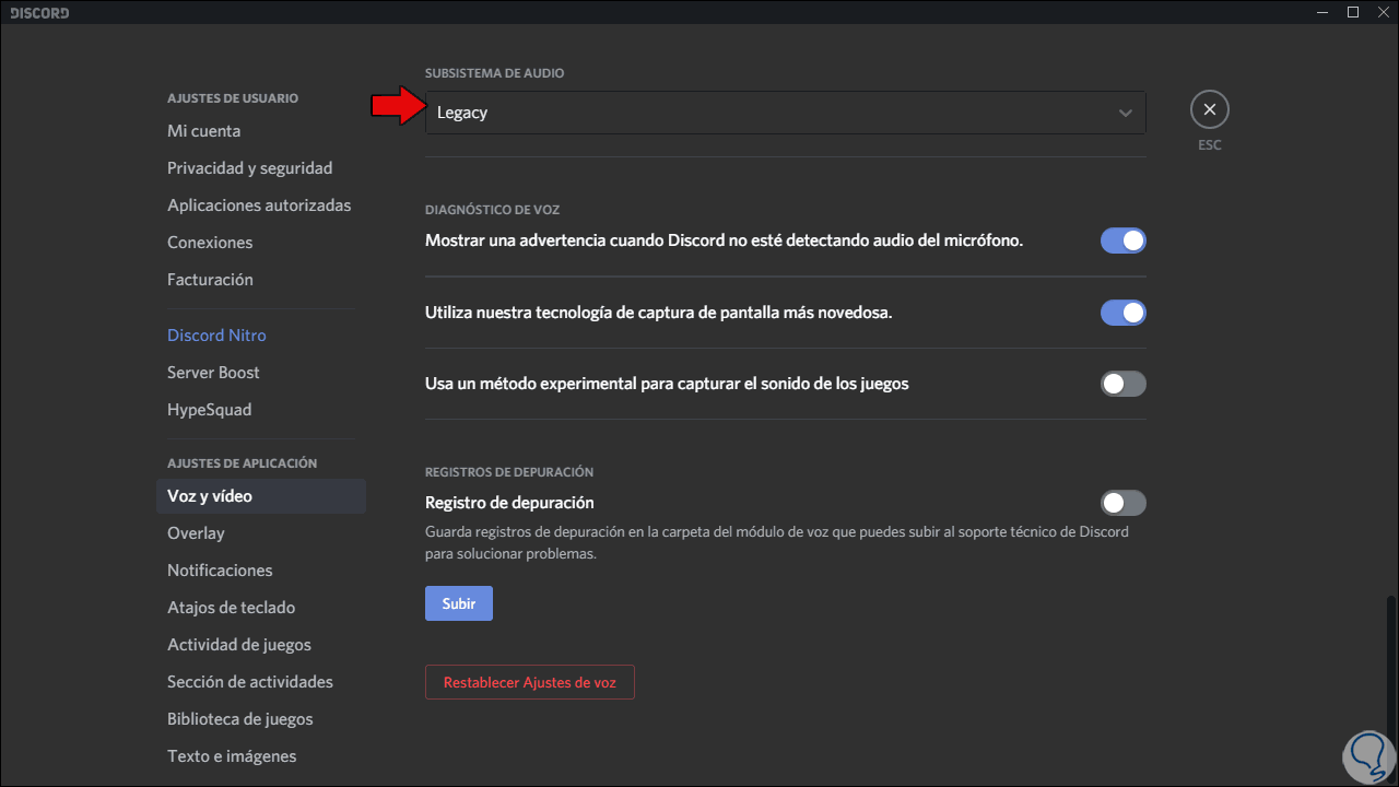 Para habilitar este modo iremos a los ajustes de usuario y en la sección “Voz y video” iremos a la parte inferior establecemos el modo “Legacy” en la línea “Subsistema de audio”: