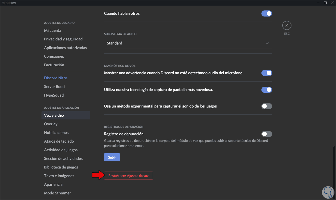 Una alternativa es restablecer los valores originales de la configuración de voz en Discord, esto permite que todo este como recién instalado y podamos validar que el micrófono funciona de la forma esperada.