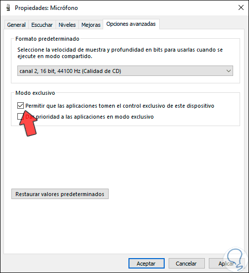 Damos clic en “Propiedades” y en la pestaña “Opciones avanzadas” desactivamos la casilla “Permitir que las aplicaciones tomen el control exclusivo de este dispositivo”. Damos clic en Aceptar y Aplicar para completar el proceso.