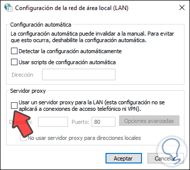 Damos clic en el botón “Configuración de LAN” y luego debemos desactivar la casilla “Usar un servidor proxy para la LAN”: