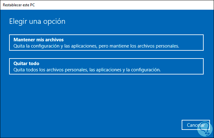 Allí damos clic en el botón “Comenzar” ubicado en la sección “Restablecer este PC” y veremos lo siguiente. Allí seleccionamos la opción más adecuada y seguimos los pasos del asistente.