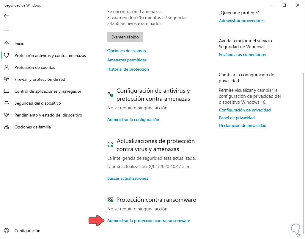 En la consola desplegada iremos a la sección “Protección antivirus y contra amenazas” y en la parte inferior encontramos la opción “Protección contra ransomware”: