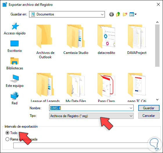 En el campo “Intervalo de exportación”, seleccionamos “Todo”, asignamos un nombre y damos clic en Guardar: