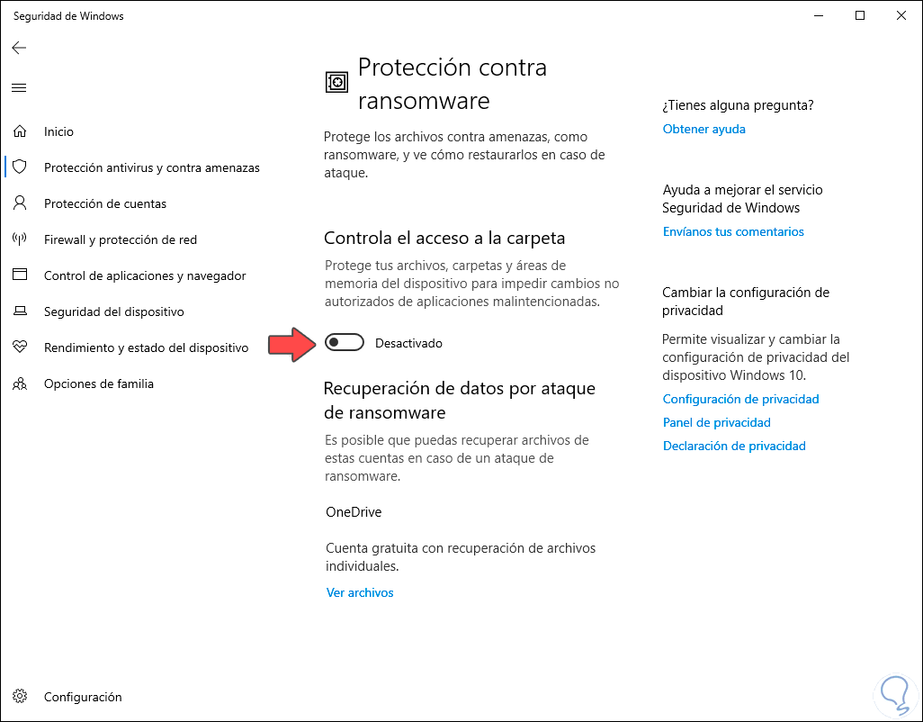 Damos clic sobre la línea “Administrar la protección contra ransomware” y en la siguiente ventana debemos desactivar la opción “Controla el acceso a la carpeta”: