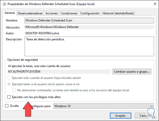 En la pestaña “General” desactivamos la casilla “Ejecutar con los privilegios más altos”: