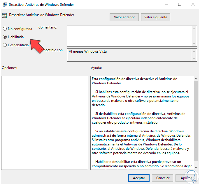 En las políticas centrales ubicamos una llama “Desactivar antivirus de Windows Defender”. Damos doble clic sobre ella y en la ventana emergente activamos la casilla “Habilitada”: