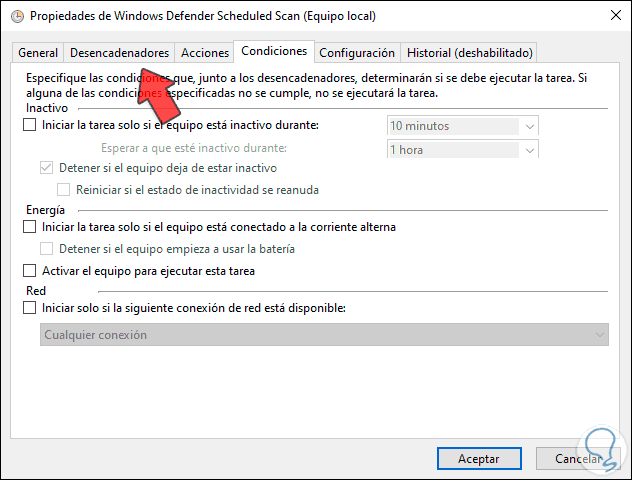 En la pestaña “Condiciones” validamos que ninguna de las casillas disponibles estén activas: